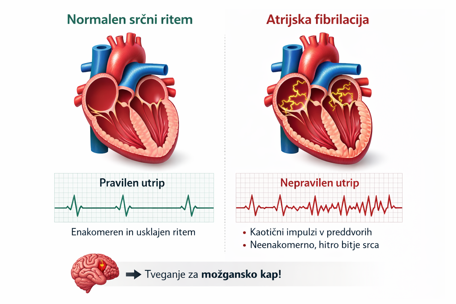 Pri zdravem srcu električni impulzi potujejo usklajeno, kar omogoča enakomerno in učinkovito črpanje krvi. Pri atrijski fibrilaciji pa pride do kaotičnih električnih signalov v preddvorih, zaradi česar ti ne utripajo več pravilno, temveč se hitro in nekoordinirano krčijo. To zmanjša učinkovitost srca in omogoča zastajanje krvi, kar poveča tveganje za nastanek krvnih strdkov in posledično možgansko kap [4].